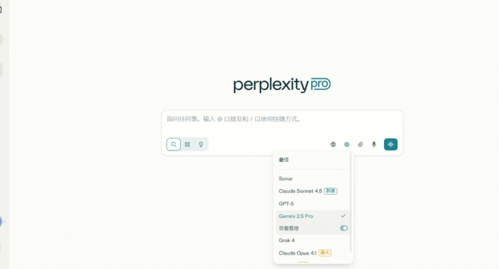 像OpenAI的GPT-5、Anthropic最新的Claude Sonnet 4.5、谷歌的Gemini 2.5 Pro和马斯克的Grok 4,这些在其他平台需要单独付费的模型,在Perplexity Pro里可以随意切换使用。