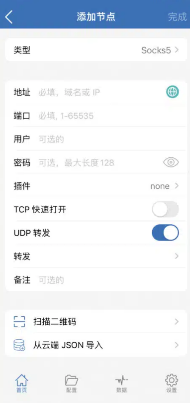 支持添加 Socks5 节点,点击软件主界面左上角 ➕ 按钮,在弹出窗口进入添加节点界面,类型选择 Socks5 后,出现 Socks5 配置界面。