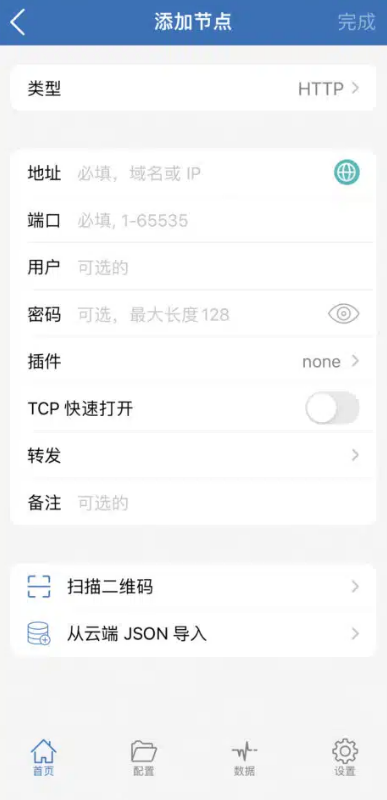 支持添加 HTTP 节点,点击软件主界面左上角 ➕ 按钮,在弹出窗口进入添加节点界面,类型选择 HTTP 后,出现 HTTP 配置界面。