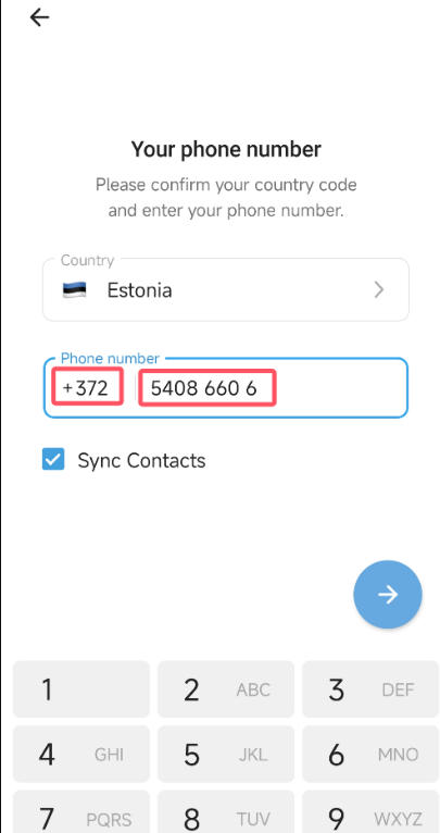 2. 输入您的手机号码(注意选择正确的国家区号,如美国为 +1,英国为 +44)。