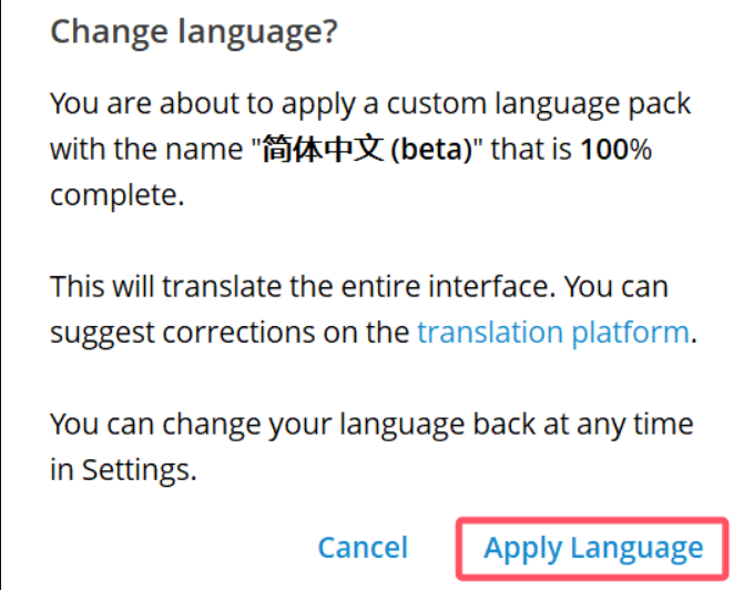 步骤3:一键完成 Telegram 中文汉化
